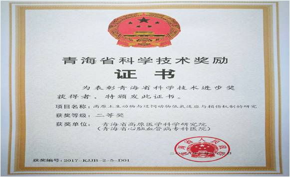 青海省科学技术奖励证书